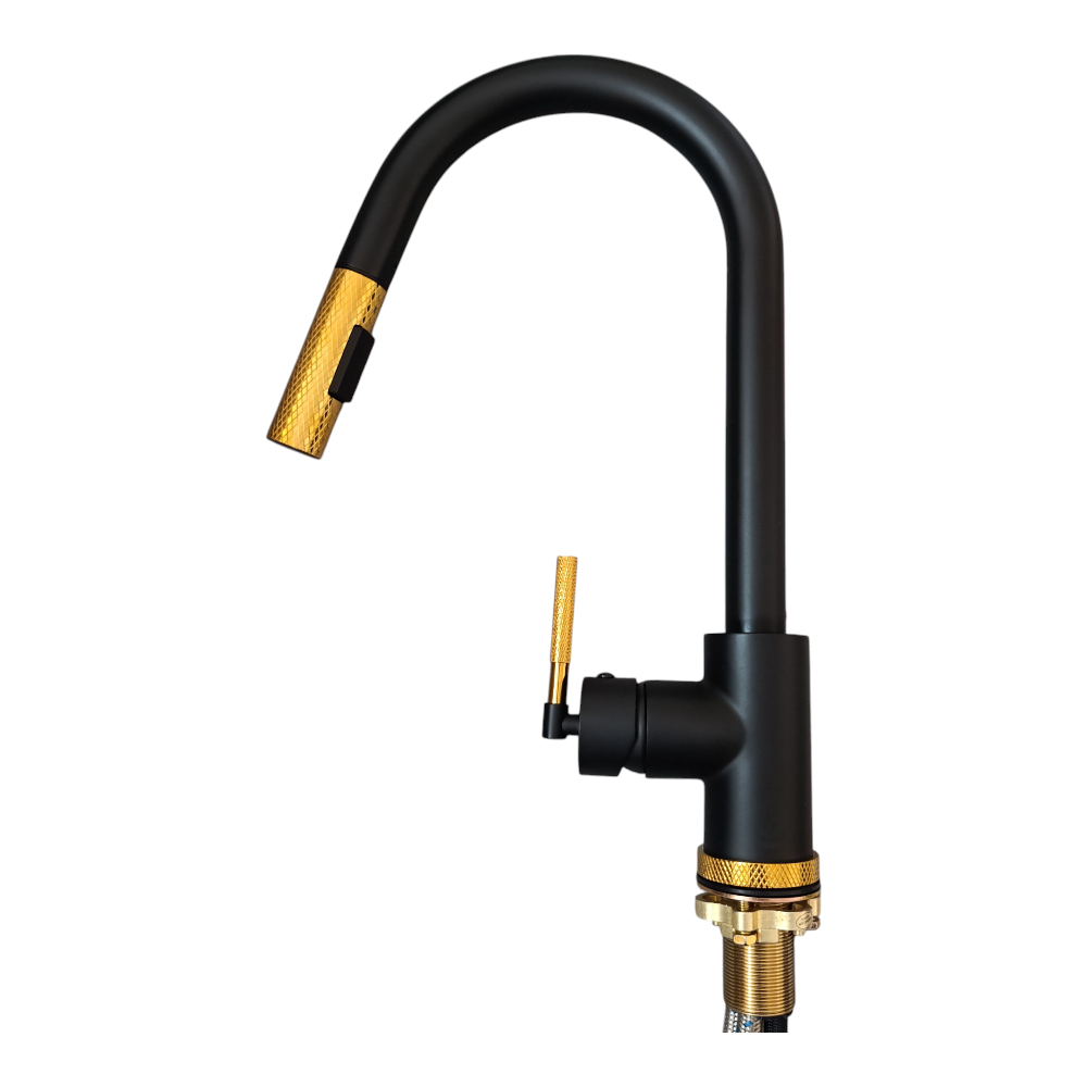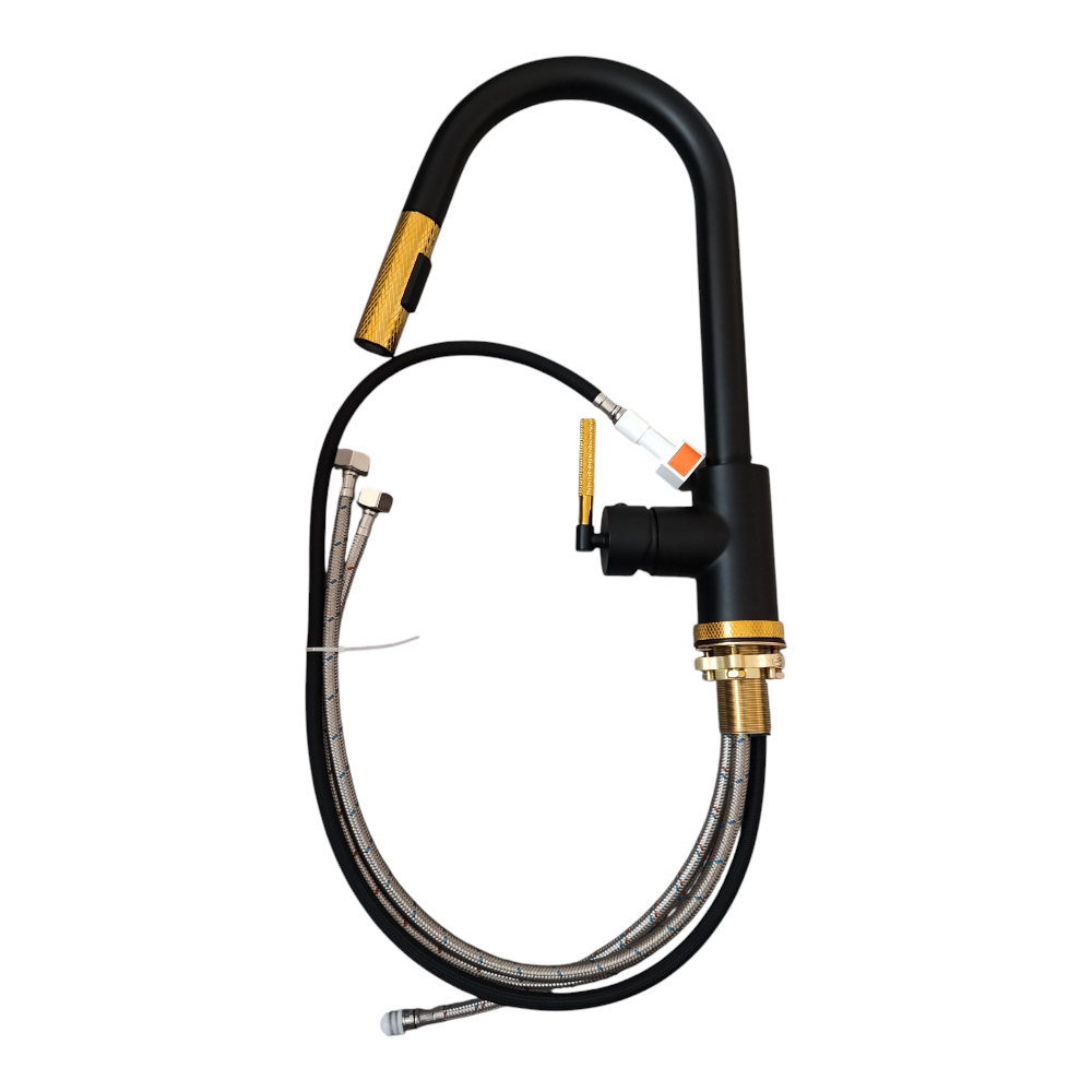 Actualiza tu cocina con este impresionante grifo monomando, que combina un diseño contemporáneo con una funcionalidad superior. Su elegante acabado en negro mate, complementado con distintivos detalles dorados, lo convierte en una pieza central que eleva instantáneamente el estilo de cualquier cocina moderna o industrial.